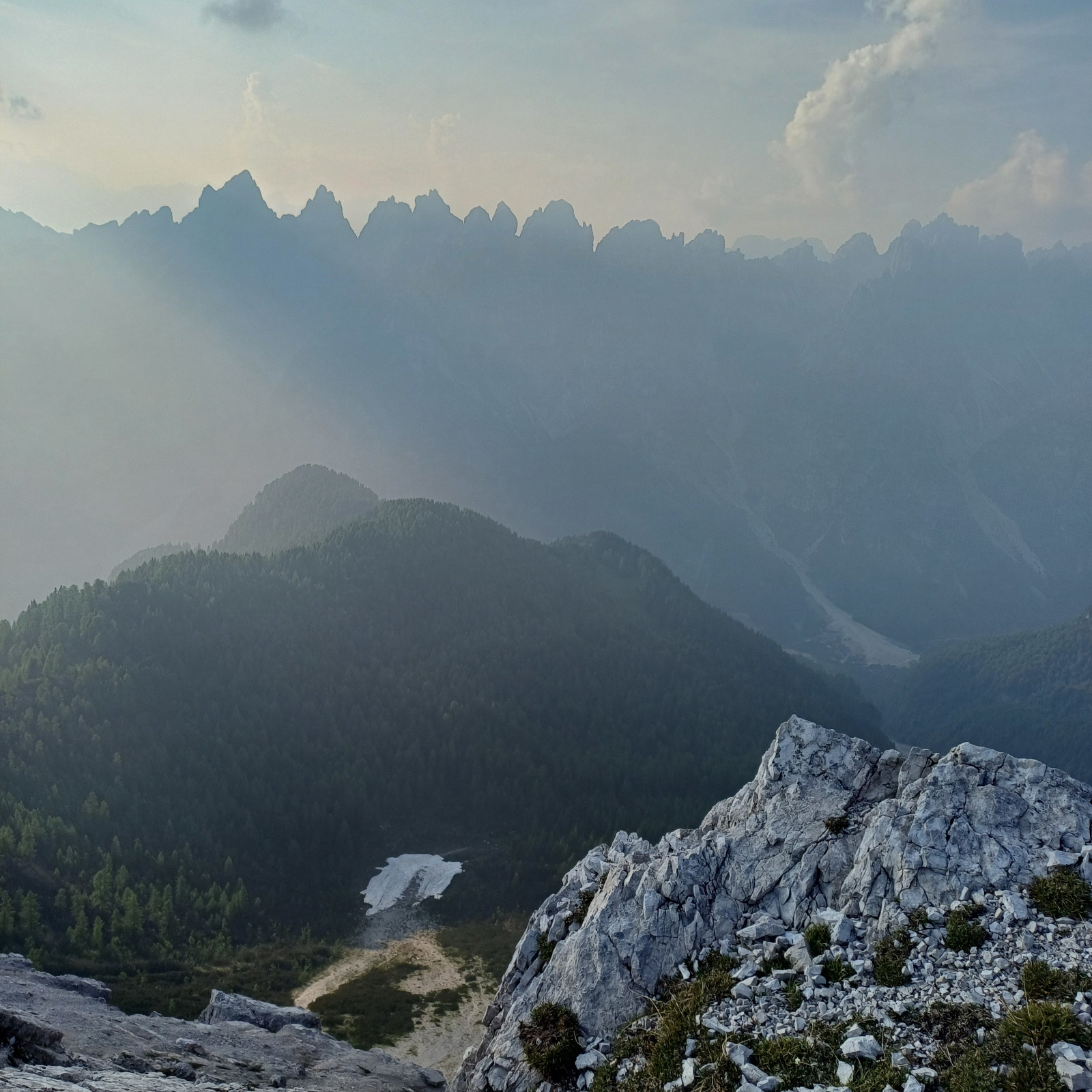 Mi trovo al centro di uno dei luoghi più magici e meravigliosi al mondo, le Dolomiti, e mi trovo ad osservarlo dal suo punto più alto, collocato, per una fatalità geografica, proprio al suo centro. Da sinistra a destra: Latemar, Catinaccio, Sasso Piatto, Sassolungo, Sella-Boè, Tofane, Cristallo, Sorapis, Antelao, Pelmo, Civetta, Pale di San Martino…