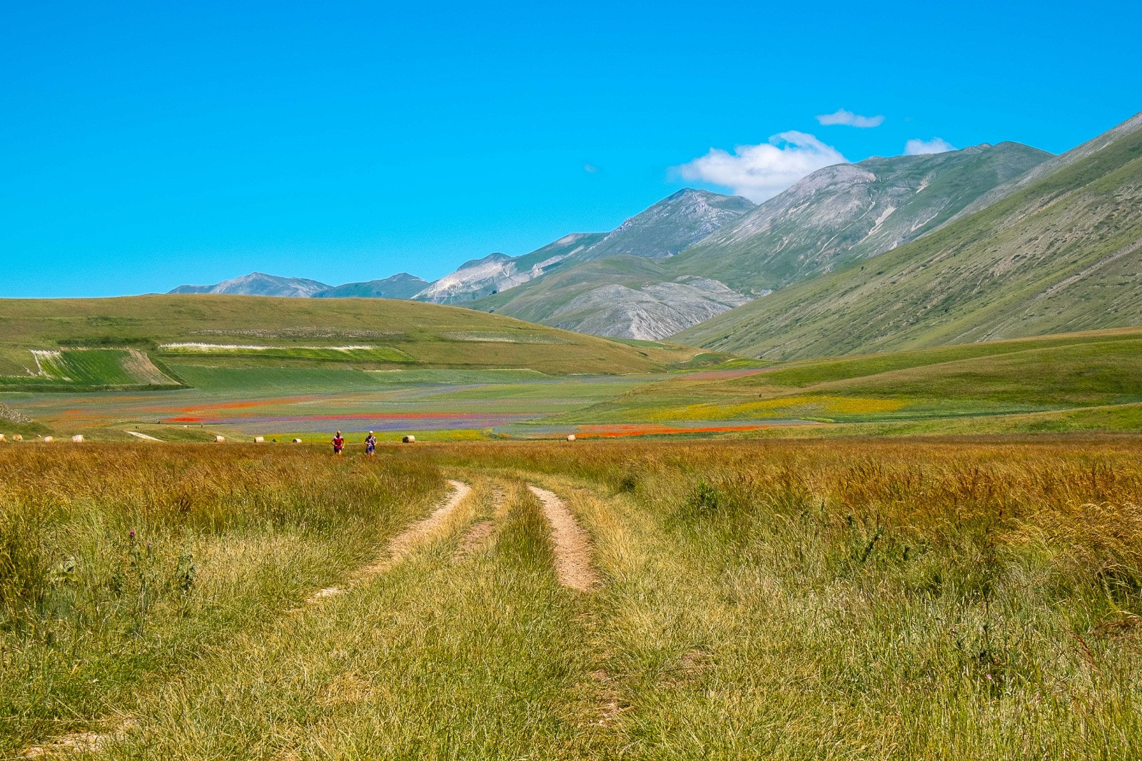L’anello parte dal Valico di Castelluccio (1520 m), punto panoramico sui Piani di Castelluccio, si sale su una pista che si porta sul lato destro del Monte Ventosola, a una forca i segnali del Grande Anello continuano sul versante destro, ma noi seguiamo la cresta, molto più panoramica, seppur più faticosa, si sale fino al Monte Vetica (1714 m), si continua a salire, per scendere poi a una forcella dove si ritrova il percorso del Grande Anello e lo si segue, per abbandonarlo poi solo quando si trova l’indicazione per Castelluccio. Seguendo una strada sterrata in discesa si arriva al paesino (11 km circa). Se capitate nel periodo della fioritura, difficile non fermarsi più volte per apprezzare la varietà di colori che riempie la piana, qualcosa che ti lascia a bocca aperta, sconsigliata la zona di Castelluccio la domenica, traffico in tilt e migliaia di persone. Poco prima del paese si prende un largo sentiero prima in discesa e poi in piano che porta a un Ranch dove si attraversa la strada e si segue una sterrata in piano, la stessa prosegue tra due vallette in direzione del Pian Piccolo, ma attorno al 18 km si prende a destra e dopo circa 3 km nei pressi di un laghetto si prende a sinistra per salire al Colle Le Cese (24 km circa). Da qui ritroviamo i segni del Grande Anello, li seguiamo in salita, siamo nella zona degli impianti sciistici di Forca Canapine, forzatamente inutilizzati a causa dei danni procurati nel 2016, un km circa di discesa poi ci riporta al punto di partenza.