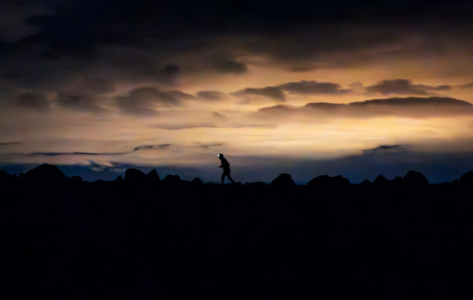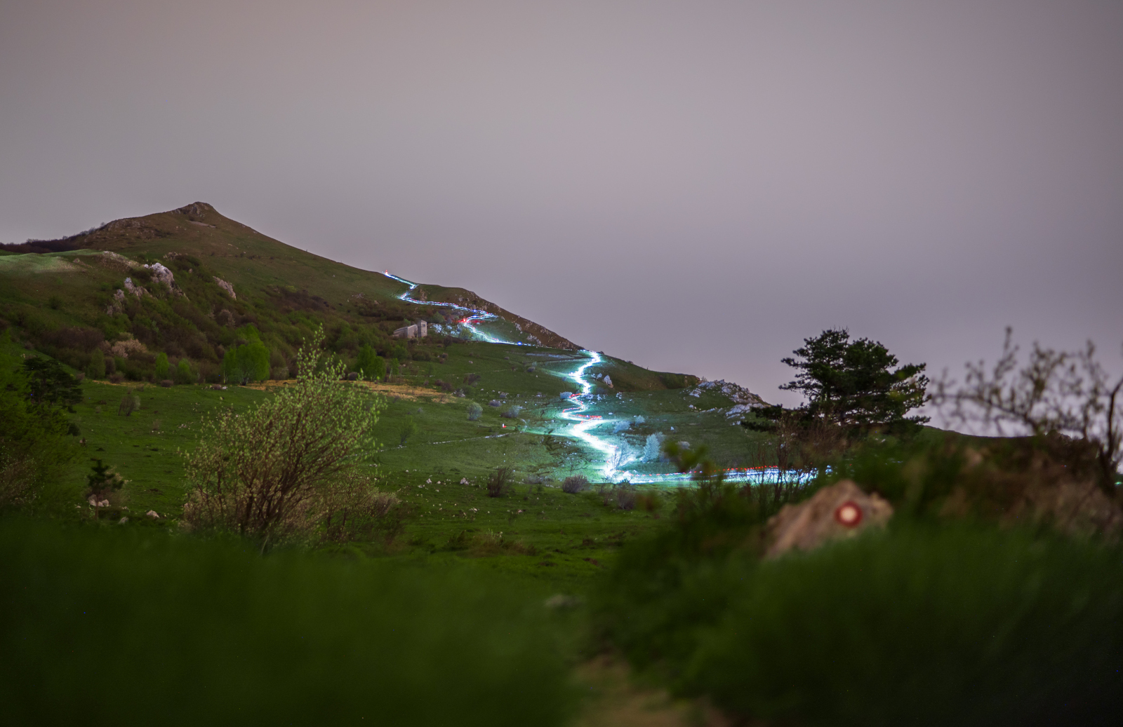 I 70 km successivi sono il vero Ultra Trail. Ti portano a "sorvolare" la valle della Vipava sul suo versante est, iniziano con la lunga salita al Mont Nanos, che ti fa dimenticare che è notte perché hai altre gatte da pelare, e terminano, dopo una discesa interminabile, sul ponte che, attraversando la Vipava, ti riporta sul suo lato occidentale. In mezzo ci sono svariate salite, molte delle quali ti faranno illudere di essere l'ultima, pascoli, rocce carsiche a volontà, panorami a strapiombo sulla valle, faggete lussureggianti, traversi infiniti con spruzzatine di cenge e ghiaioni dolomitici, svariati ristori con menù variegati che meriterebbero soste ben più goderecce di quelle in mezzo ad una gara, viste lontane sul mare del golfo di Trieste e sulle cime imbiancate delle Alpi, e parecchia fatica.